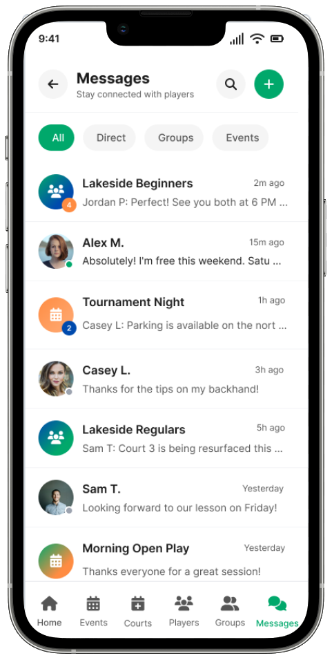 Reserve your court through CourtReserve integration, join groups, and start chatting with other players.