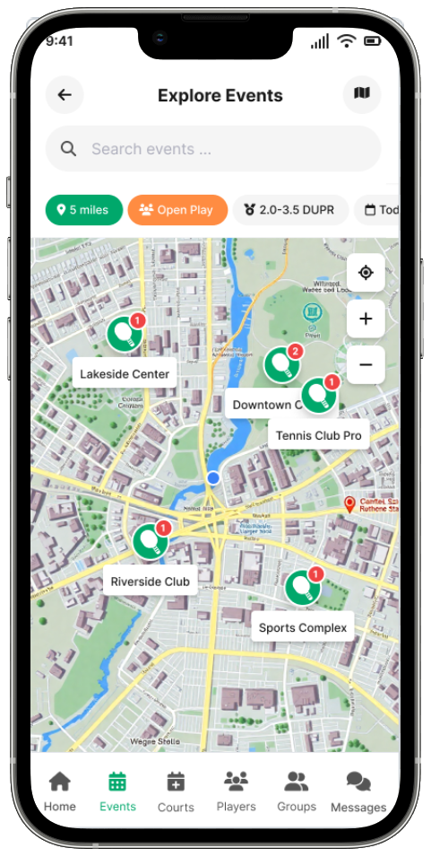 Browse available courts, open play sessions, and organized events on an interactive map or list view.