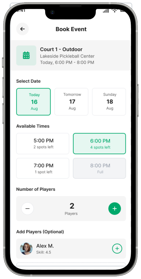 Create your profile, set your skill level (DUPR), and choose your preferred locations and playing times.
